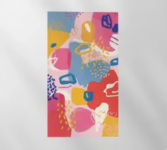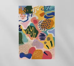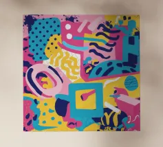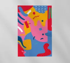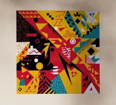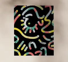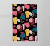 Un motivo dinamico e divertente di forme astratte colorate e di ispirazione retrò è sparso come coriandoli su uno sfondo nero, creando un disegno vibrante ed energico dal sapore vintage.