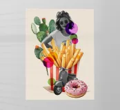 Un collage giocoso e retrò che fonde l'estetica vintage con la cultura pop: una ragazza degli anni '60 in bianco e nero con occhiali tondi e sciarpa si trova di fronte a un cactus mediterraneo, un cono gigante di patatine fritte, una Vespa nera e una ciambella rosa con zuccherini colorati. La composizione è arricchita da audaci cerchi di colore in stile grafico. Perfetta per gli spazi creativi, le cucine moderne o gli interni degli amanti della pop art.