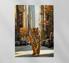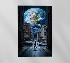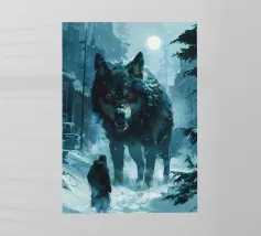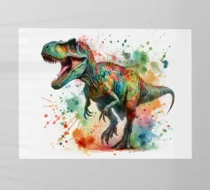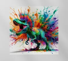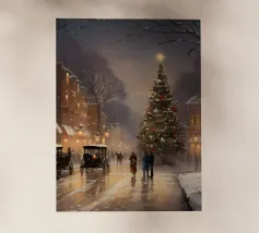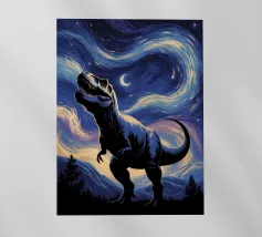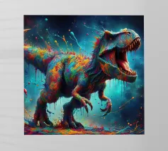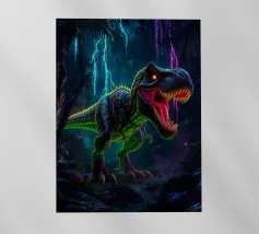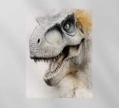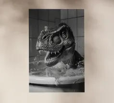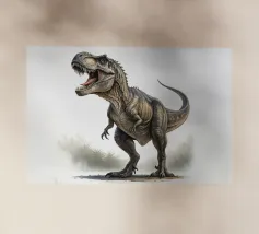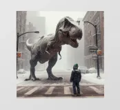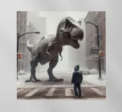Un enorme T-Rex sovrasta un bambino in una scena di città invernale, circondato da strade innevate e alti edifici. L'incontro surreale contrappone la potenza preistorica a un moderno paesaggio urbano.
