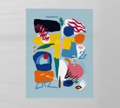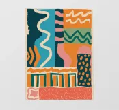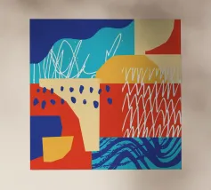Una composizione astratta verticale con una cascata di forme e motivi colorati e ritmici, tra cui onde, griglie e forme organiche, in una tavolozza di arancione, blu e verde acqua.