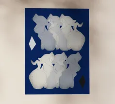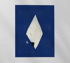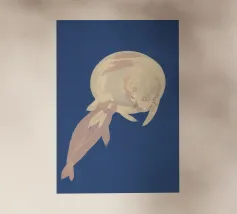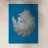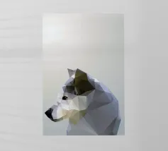 Un lupo bianco sembra emergere da una nuvola di nebbia su un suggestivo sfondo blu. La raffigurazione del lupo è morbida ed eterea, con i suoi dettagli che sfumano delicatamente nel vapore circostante.