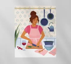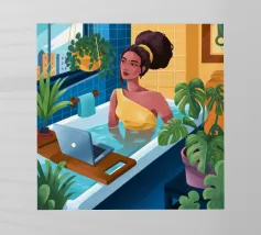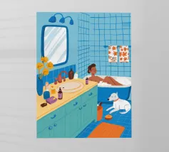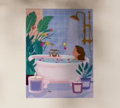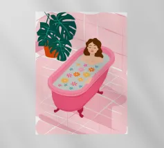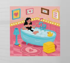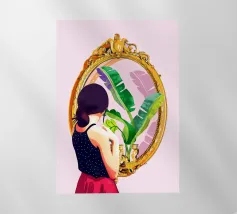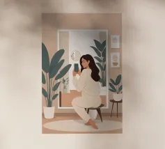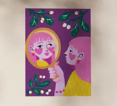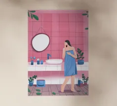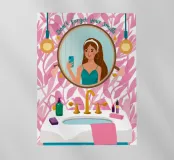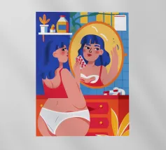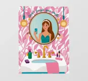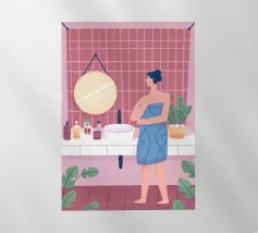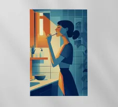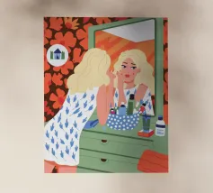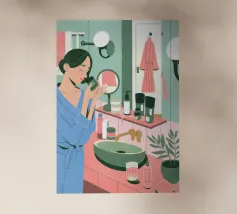 Illustrazione di una donna che guarda il suo riflesso in uno specchio ornato, circondata da vari prodotti di bellezza su un bancone del bagno. La scena è un'istantanea chic, intima ed elegante di una routine di bellezza quotidiana.