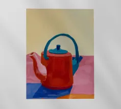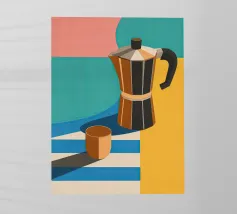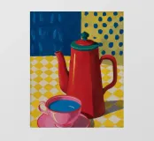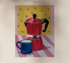A classic coffee moment is captured with a tall red coffee pot and a pink cup on a yellow and white checkered tablecloth, set against a deep blue background, creating a cozy and colorful scene.