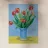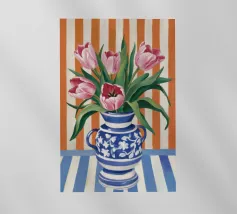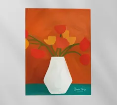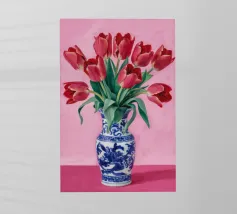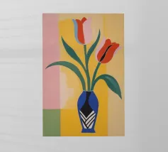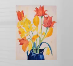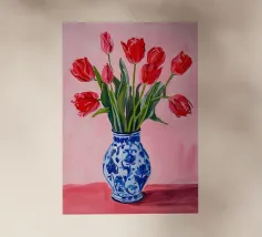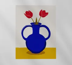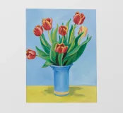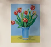 Un classico dipinto di natura morta con tulipani rossi vivaci che svettano in un vaso cilindrico azzurro, posto su un tavolo giallo su uno sfondo blu complementare.