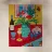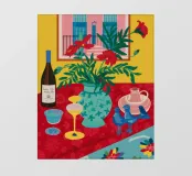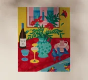 Una scena di natura morta su una tovaglia rossa presenta bottiglie di vino, bicchieri, una brocca e frutta, con vivaci elementi di sfondo verdi e gialli, che suggeriscono una riunione festosa e conviviale.