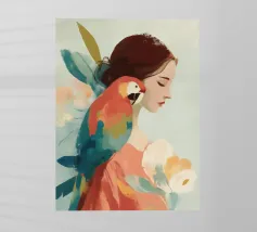 Questa opera d'arte mostra una persona con un maglione rosso che tiene in mano un gallo. Lo sfondo è scuro e mette in risalto gli elementi rustici e affascinanti della scena.