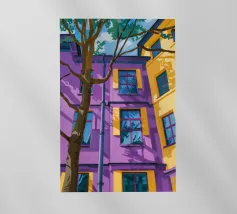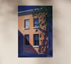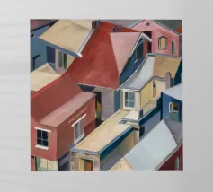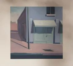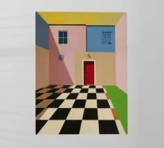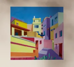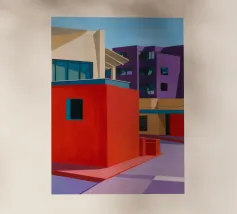 Una complessa scena urbana è resa con un'attenzione particolare alle forme geometriche e a un'audace tavolozza di colori rosa, verde acqua e rosso. Una scala esterna fornisce un forte elemento compositivo, guidando l'occhio attraverso le forme architettoniche astratte.