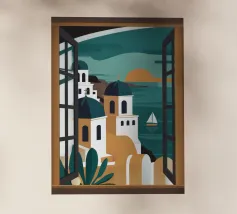 Una vista pittoresca dei classici edifici a cupola blu di un'isola greca come Santorini, visti da una finestra ad arco. Questa splendida scena cattura perfettamente il fascino idilliaco di una vacanza nel Mediterraneo.
