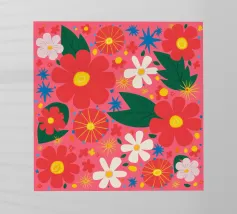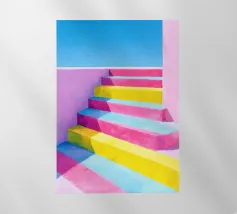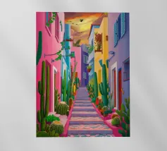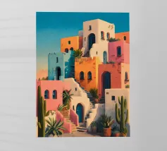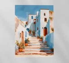 Quest'opera d'arte cattura la bellezza iconica di un'isola greca con i suoi gradini vivaci e colorati nei toni del rosa, dell'arancione e del rosso. La classica architettura bianca e blu incornicia la scena, creando un'immagine gioiosa e pittoresca che trasporta immediatamente in un vicolo soleggiato di Santorini.