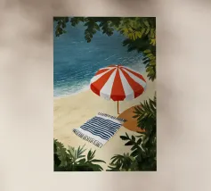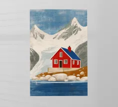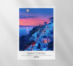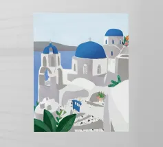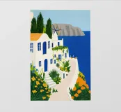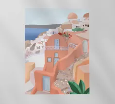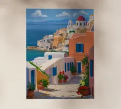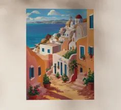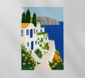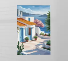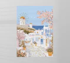 L'immagine mostra un idilliaco paesaggio costiero con case imbiancate a calce, porte e finestre blu e tetti color arancio, che si adagiano come terrazze su una scogliera rocciosa. Sullo sfondo svetta un mulino a vento, mentre il mare blu intenso luccica sotto un cielo limpido. Una vegetazione rigogliosa e fiori colorati costeggiano i sentieri. Lo stile è pittoresco e romantico, ispirato all'architettura mediterranea - in particolare all'isola greca di Santorini - e trasmette tranquillità, calore e bellezza senza tempo.