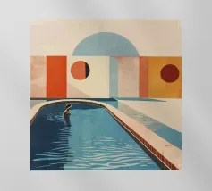 Poster raffigurante una piscina estiva con una scala arancione e riflessi d'acqua stilizzati. Un gioco di ombre, luci grafiche e una tavolozza solare. Perfetto per un look vintage e rinfrescante.