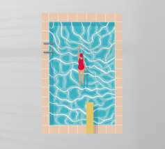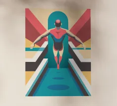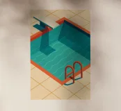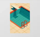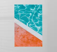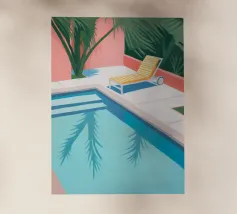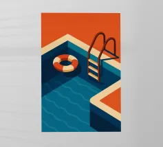 Poster raffigurante una piscina estiva con una scala arancione e riflessi d'acqua stilizzati. Un gioco di ombre, luci grafiche e una tavolozza solare. Perfetto per un look vintage e rinfrescante.