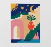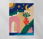 Una scena d'interni stravagante e astratta con una scala rosa, piante in vaso e un sole e una luna nel cielo visti attraverso un arco. L'opera d'arte è un paesaggio da sogno giocoso e bohémien.