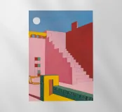 Un'opera architettonica di grande effetto, con una lunga scala rosa che sale verso un sole o una luna gialli e luminosi in un cielo blu scuro. La composizione è audace, minimalista e fortemente simbolica.