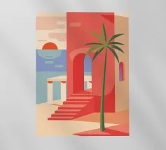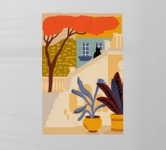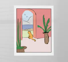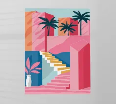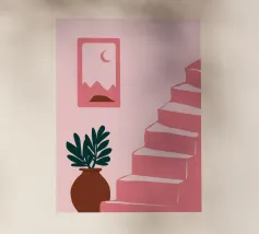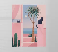 Un gatto bianco siede pacificamente sul pianerottolo di una scala esterna di un edificio dalle pareti rosa. La scena, con le sue linee pulite e gli archi, è un'istantanea architettonica serena, minimalista e affascinante.