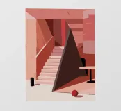 Un'imponente scalinata domina uno spazio interno reso interamente in toni di rosa, salmone e terracotta, creando una scena calda, monocromatica e lunatica.