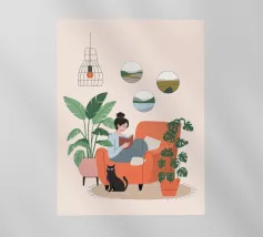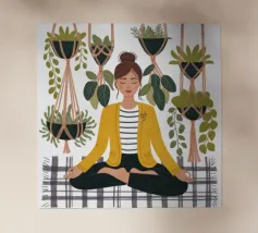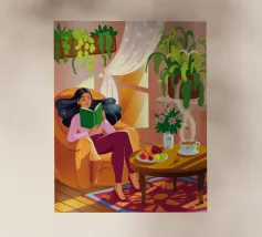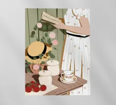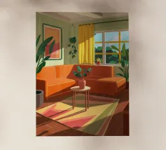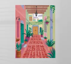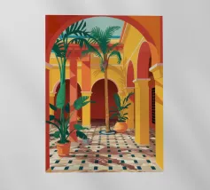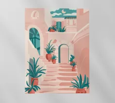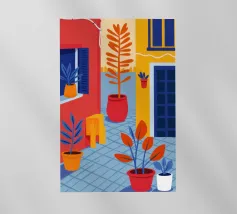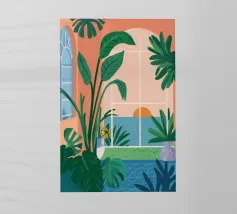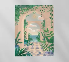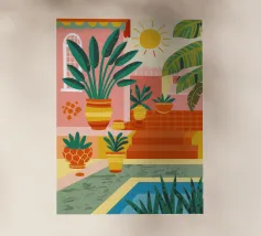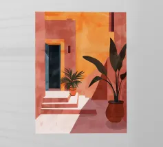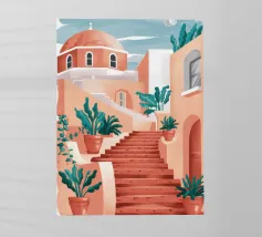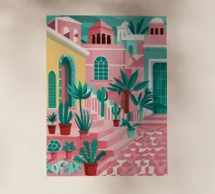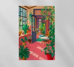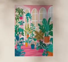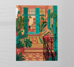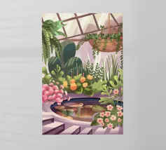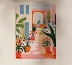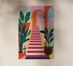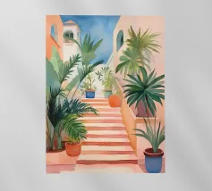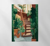 Questo dipinto raffigura una scala circondata da piante in vaso, creando un'oasi verde in un ambiente interno. La scena è rilassante e piena di bellezza naturale, e sottolinea l'armonia tra architettura e natura.