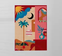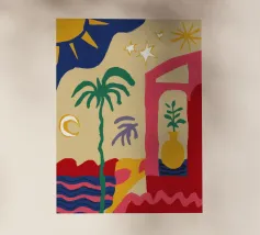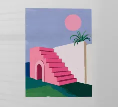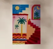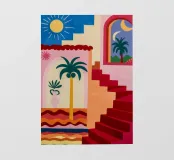 Scale rosse e vivaci conducono verso l'alto passando davanti a una finestra che rivela un cielo soleggiato, una palma e un sole splendente, a simboleggiare un viaggio verso una destinazione gioiosa.