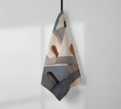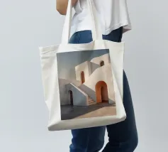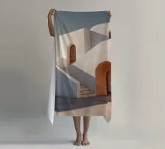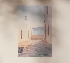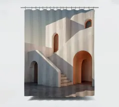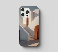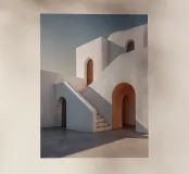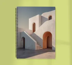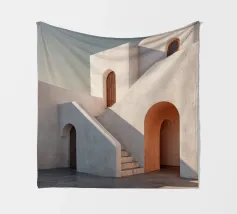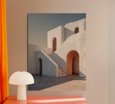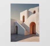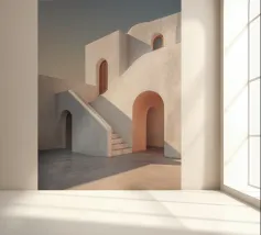 L'architettura del cortile è immersa in una luce dorata, con scale geometriche, archi arrotondati e pareti bianche strutturate in uno stile mediterraneo minimalista. Una tavolozza morbida di beige, sabbia e terracotta, ideale per un design moderno ed elegante. Perfetta per un soggiorno, un ufficio creativo o una camera da letto, per creare un ambiente caldo, architettonico e contemporaneo.