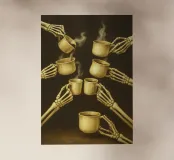 Scheletro con caffè in mano