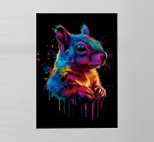 Uno scoiattolo curioso si affaccia vivacemente dal quadro, raffigurato con colori intensi e brillanti su uno sfondo nero. La tavolozza dei colori spazia dal blu intenso e dal rosa brillante al giallo caldo e al rosso vibrante. I passaggi sono fluidi e ricordano le pennellate, mentre singoli schizzi e gocce di colore conferiscono al motivo un effetto dinamico, quasi esplosivo. L'animale appare vigile e vivace, con dettagli finemente lavorati nella sua pelliccia e un grande occhio lucido che guarda direttamente lo spettatore.