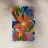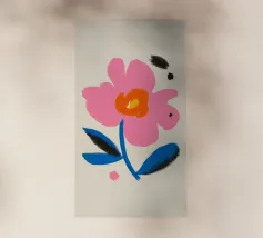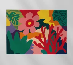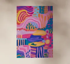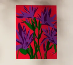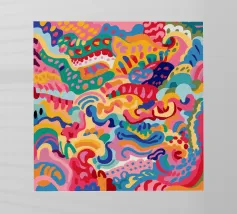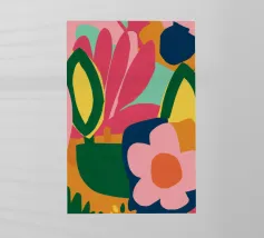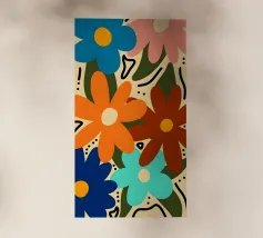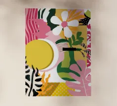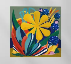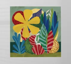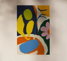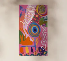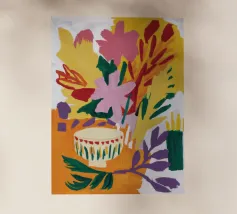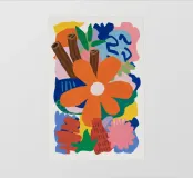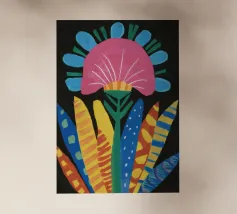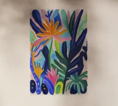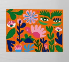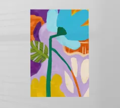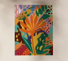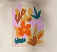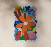 Una forma centrale arancione simile a un fiore esplode in mezzo a un turbinio di forme astratte ed elementi botanici. La composizione è dinamica ed espressiva, con steli blu, accenti rossi e uno sfondo beige strutturato, che cattura un momento di energia creativa.