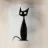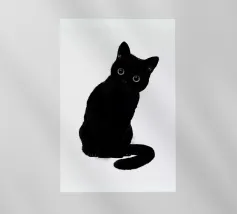 Illustrazione minimalista in bianco e nero di un elegante gatto nero con occhi esageratamente grandi e lineamenti abbozzati. Il disegno astratto e stravagante del gatto aggiunge un tocco artistico e giocoso.