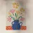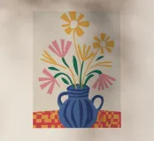 Un'illustrazione semplice e affascinante di un bouquet di margherite colorate e stilizzate in un vaso blu, su una superficie a scacchi rossi e bianchi. L'opera d'arte emana un senso di pura e semplice gioia e fascino rustico.