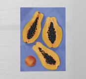 Una natura morta semplice ed elegante di una papaya tagliata a metà su un piatto blu intenso. La composizione minimalista e il sorprendente contrasto cromatico tra il frutto arancione e il piatto blu creano un pezzo moderno e sofisticato.