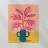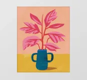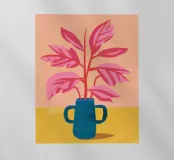 Un'illustrazione semplice ma d'effetto di una pianta dalle foglie rosa in un audace vaso blu su uno sfondo caldo, che celebra la bellezza del colore e della forma botanica minimalista.