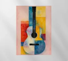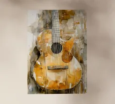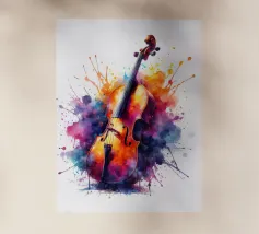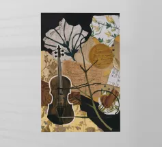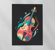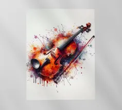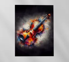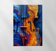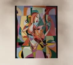 Un'opera d'arte astratta di grande impatto che raffigura un violino in stile cubista, con forme geometriche sovrapposte e una ricca tavolozza di colori di tonalità terrose, blu e oro. La composizione enfatizza la consistenza, la profondità e il movimento.