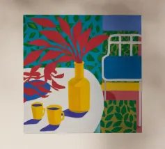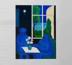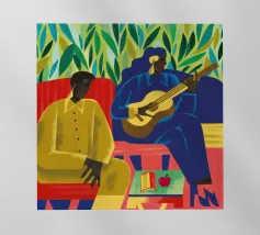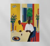 Una scena intima di interni che ritrae due persone, una di carnagione scura e una di carnagione chiara, sedute a un tavolo di colore giallo acceso, forse intente a condividere un pasto o una conversazione. Alle loro spalle, attraverso una finestra, si intravede del fogliame verde che contribuisce a creare un'atmosfera calda e accogliente.
