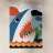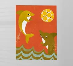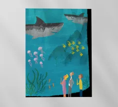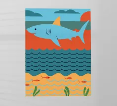 Godetevi una vibrante illustrazione dell'oceano con uno squalo che attacca un pesce in mare con pioggia e nuvole sullo sfondo.