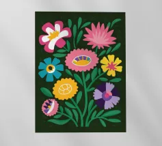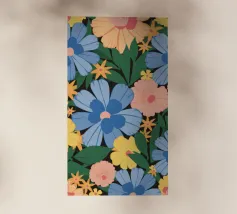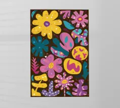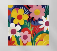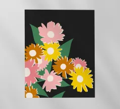 A simple and cheerful pattern of stylized daisies in various colors against a dark background creates a classic, beautiful, and timeless floral design.