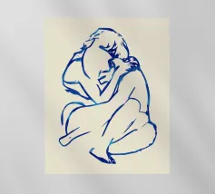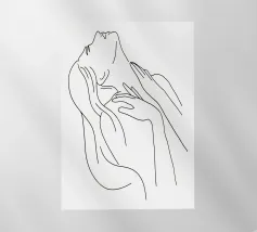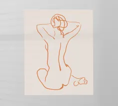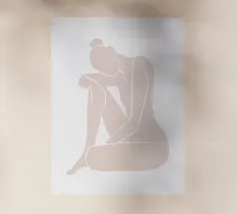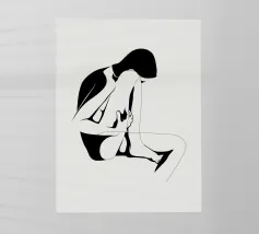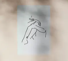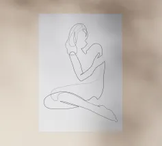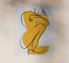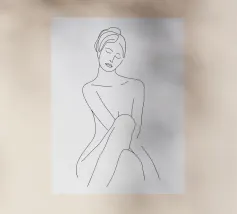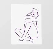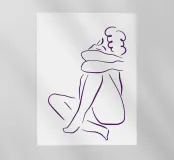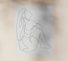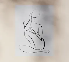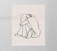 Un semplice disegno al tratto raffigura una persona seduta con i capelli ricci, le braccia avvolte intorno alle ginocchia. Lo stile minimalista utilizza linee morbide e fluide per trasmettere un senso di calma e introspezione.