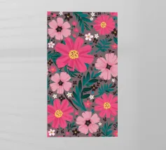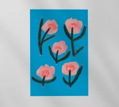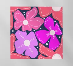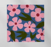 Un motivo senza soluzione di continuità di fiori rosa stilizzati con centro giallo su uno sfondo blu scuro. Le forme semplici e decise creano un disegno floreale classico e allegro con un fascino moderno e grafico.