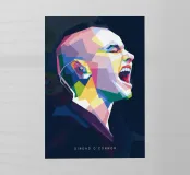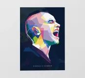 Un ritratto vibrante e geometrico di Sinead O'Connor in stile WPAP, caratterizzato da forme audaci e angolari e da un'impressionante gamma di colori vivaci e contrastanti. L'opera cattura i suoi tratti iconici, come la testa rasata, gli occhi penetranti e la forte espressione facciale, utilizzando blocchi di colore nitidi e frammentati. La composizione enfatizza la profondità e l'emozione mantenendo l'estetica pop-art cubista distintiva di WPAP, creando un tributo visivamente dinamico e moderno alla leggendaria cantante.