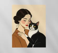 Una persona che indossa un vivace top arancione tiene vicino un elegante gatto nero, i loro sguardi sono allineati, evidenziando il forte legame tra l'uomo e l'animale domestico su uno sfondo semplice e dai toni caldi.