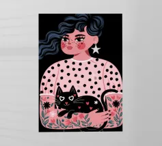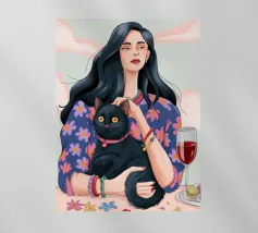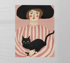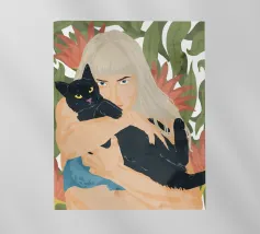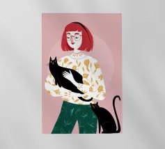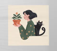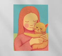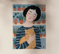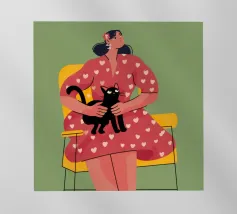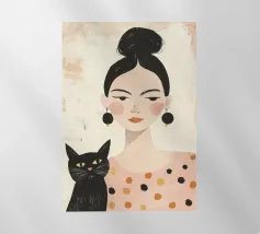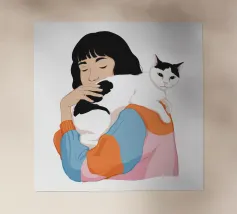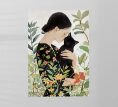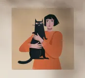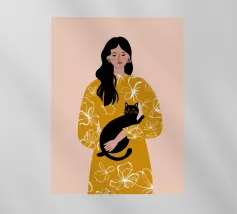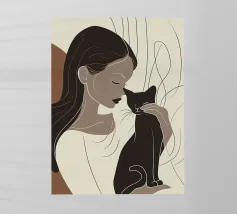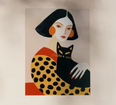 Una persona che indossa un vivace top arancione tiene vicino un elegante gatto nero, i loro sguardi sono allineati, evidenziando il forte legame tra l'uomo e l'animale domestico su uno sfondo semplice e dai toni caldi.