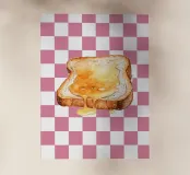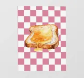 Una fetta di pane tostato è ricoperta da una generosa quantità di miele, la cui tonalità dorata contrasta con lo sfondo rosa e bianco a scacchi. La composizione, semplice ma vivace, mette in risalto la dolcezza appiccicosa del miele che brilla sotto la luce.