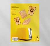 Fette di pane tostato con facce sorridenti fluttuano sopra un tostapane giallo. Sullo sfondo sono presenti testi sul confezionamento, la produzione e la miscelazione, che sottolineano la sostenibilità e il risparmio energetico.