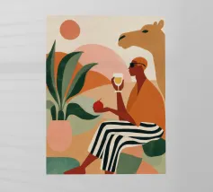 Mescolando toni di metà secolo e grazia moderna, questo pezzo esplora l'intersezione tra forma e solitudine. La palette di colori tenui e la geometria audace riecheggiano la presenza tranquilla della donna, creando una composizione che sembra un jazz visivo, sofisticato e senza sforzo.