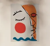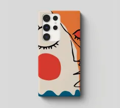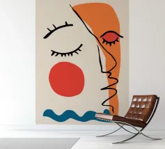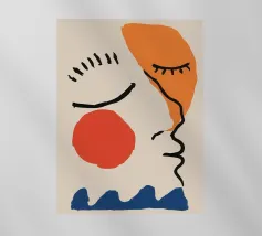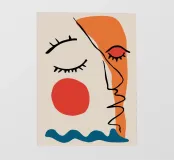 Un ritratto astratto minimalista e sereno di un volto con gli occhi chiusi, composto da forme semplici e organiche. Il sole rosso e le linee ondulate creano un'atmosfera calda, pacifica e onirica.