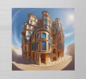 Una struttura architettonica surreale con caratteristiche curve e distorte, che fonde stili classici e moderni, si erge sotto un cielo blu brillante. La strada di ciottoli e la luce soffusa del sole esaltano l'atmosfera stravagante e onirica.