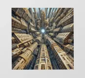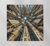 Una surreale visione fisheye di strutture urbane torreggianti con dettagli intricati e modelli simmetrici, che convergono verso un cielo radioso. Il design architettonico stratificato evidenzia l'innovazione moderna e la creatività artistica.
