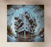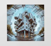 Un sorprendente edificio modulare con elementi futuristici, tubi e strutture sferiche, circondato da un paesaggio urbano distorto. La composizione fantasiosa fonde l'architettura moderna con il surrealismo, creando una prospettiva unica e dinamica.