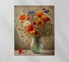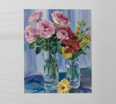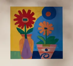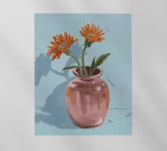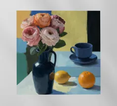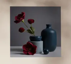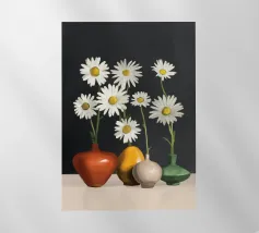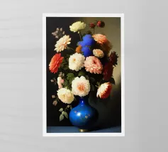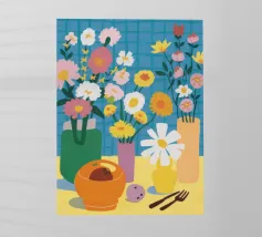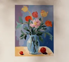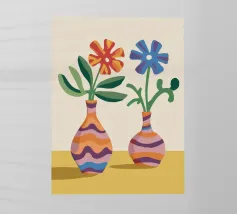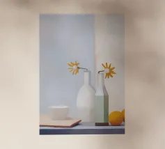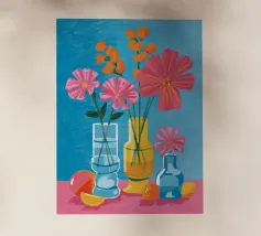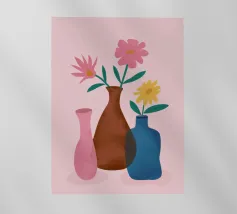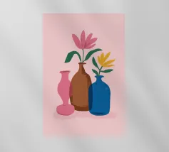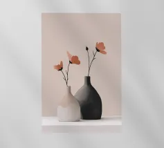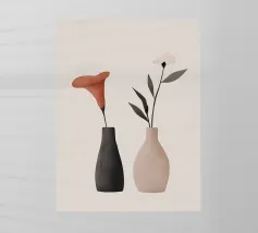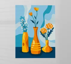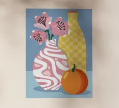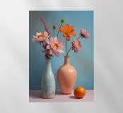 Elegante poster di natura morta con vasi in ceramica dai toni pastello riempiti di fiori sbocciati rosa e arancioni, su un morbido sfondo blu. Perfetto per aggiungere un tocco artistico e sereno agli interni moderni. Ideale per gli amanti dell'arte e dell'arredamento in cerca di ispirazione floreale.