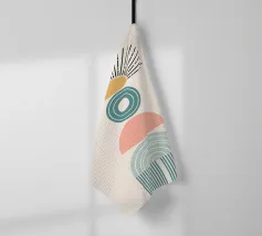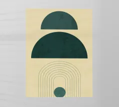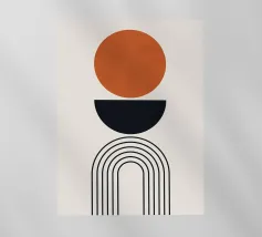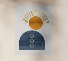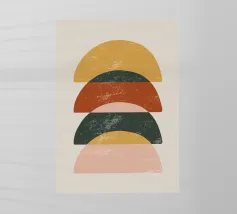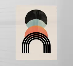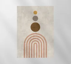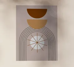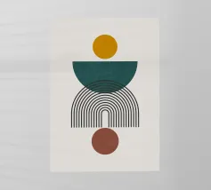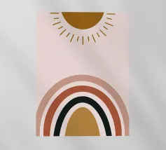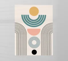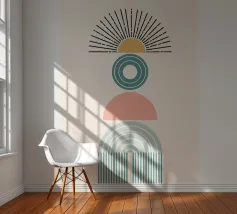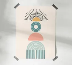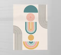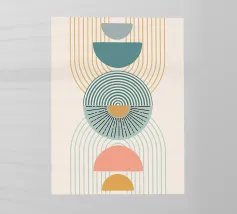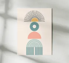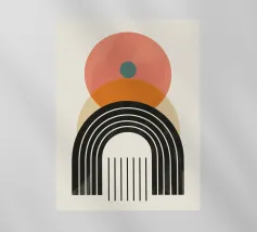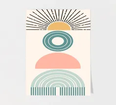 Una composizione geometrica presenta varie forme, tra cui un semicerchio che ricorda il sole, cerchi concentrici e archi in tenui tonalità pastello. Il disegno è simmetrico e bilancia gli elementi visivamente attraenti.