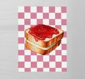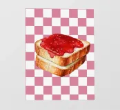 Una pila di tre fette di pane tostato con sopra un generoso strato di marmellata rossa brillante si trova su uno sfondo a scacchi bianchi e rosa. La rappresentazione realistica del pane contrasta con lo sfondo geometrico e giocoso.