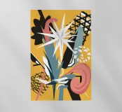 An energetic abstract collage combines a bold star shape with colorful scribbles and patterns, creating a playful, imaginative, and celestial-themed piece of art.